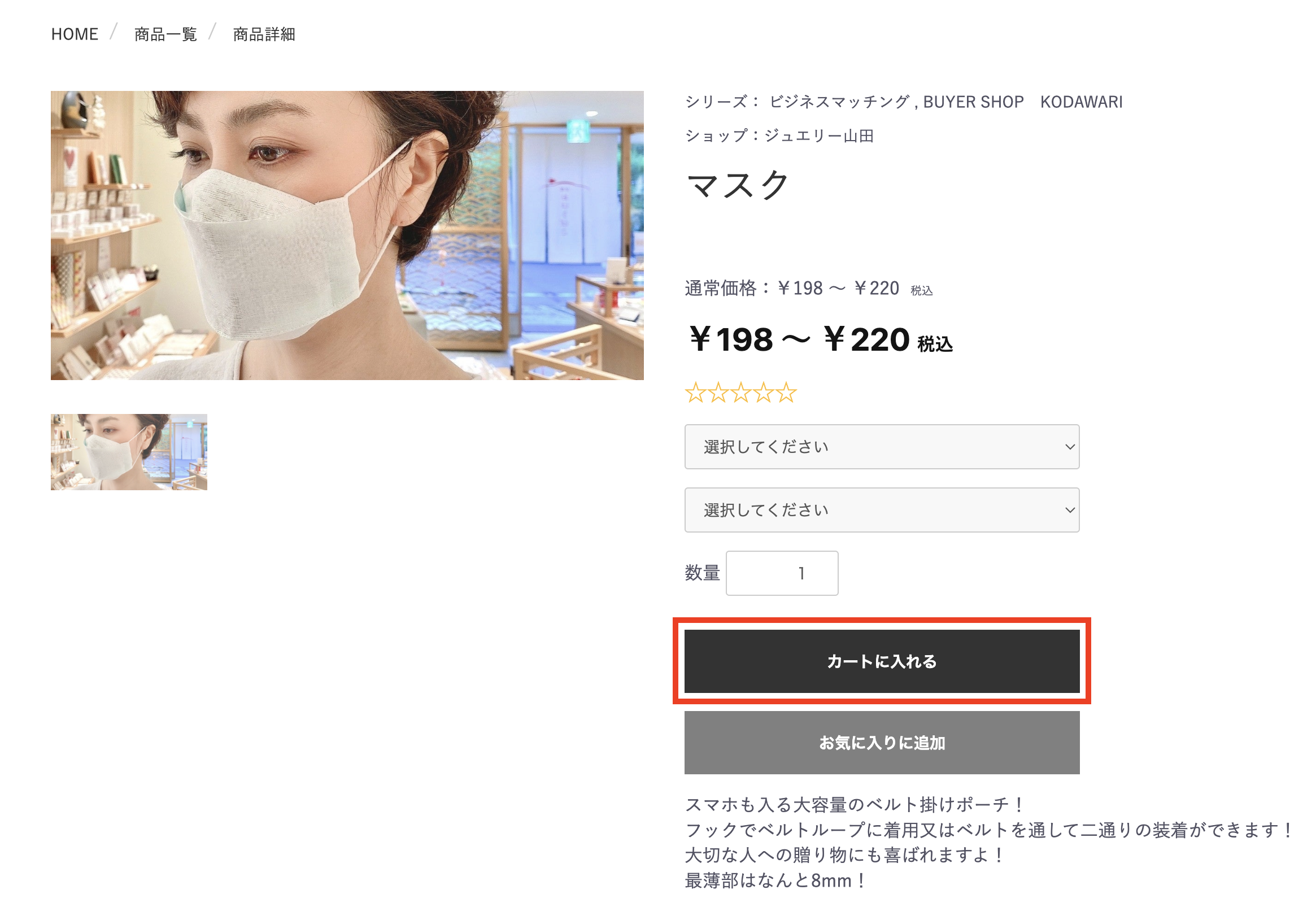 - 買い物を続ける場合は、購入個数を入力して「カートに入れる」ボタンをクリックします。