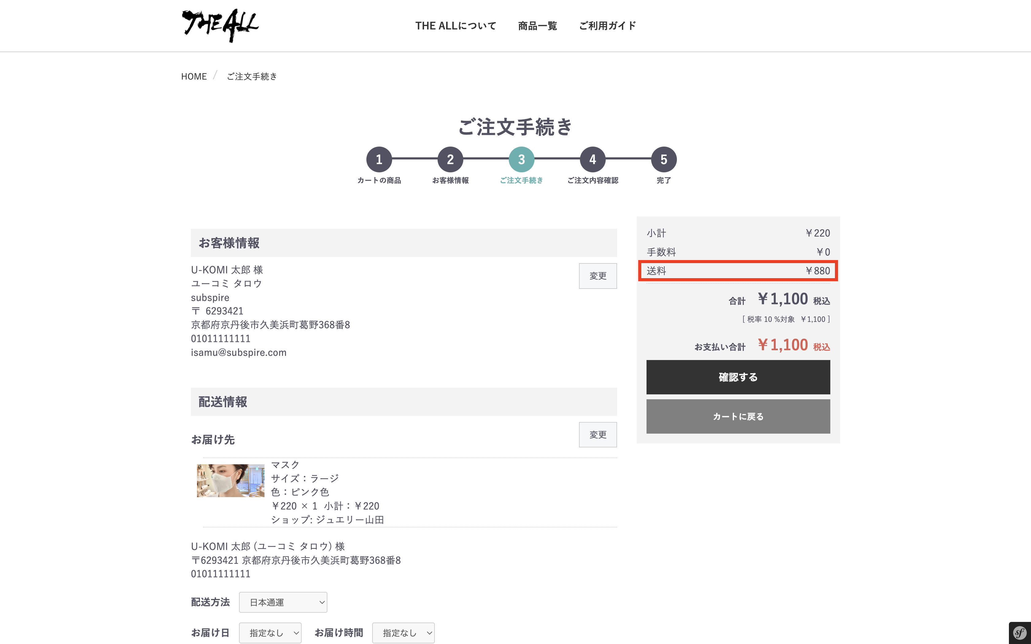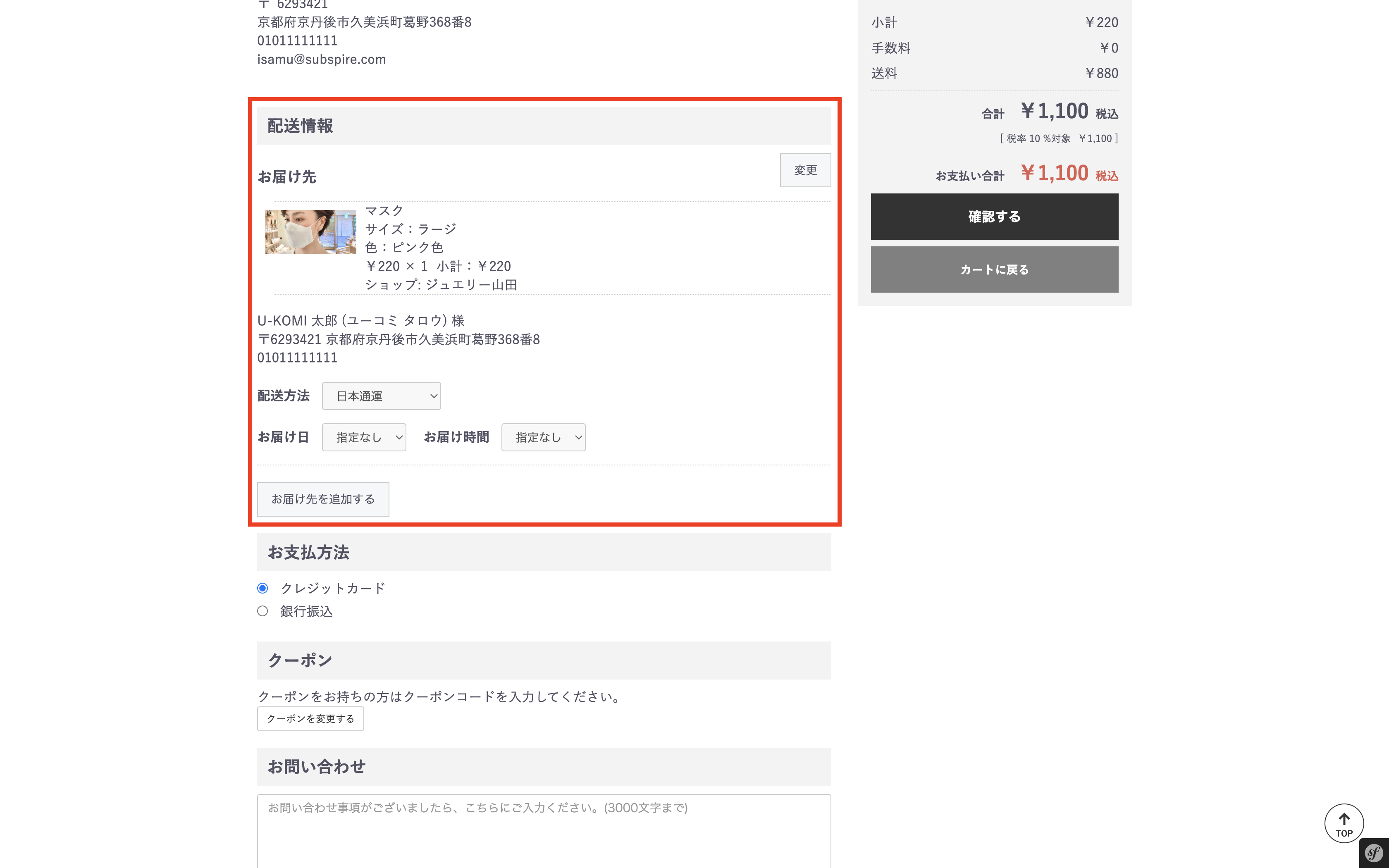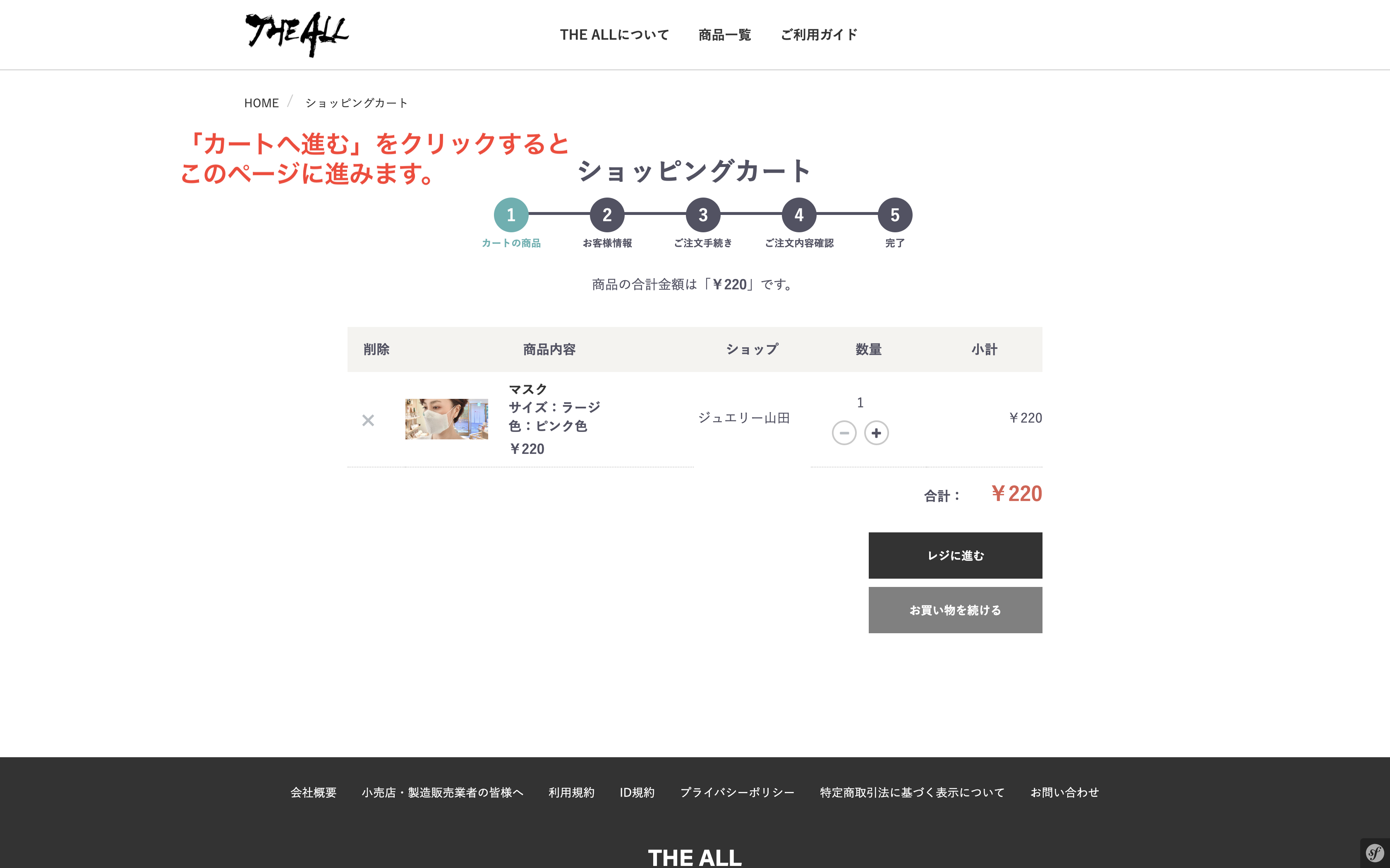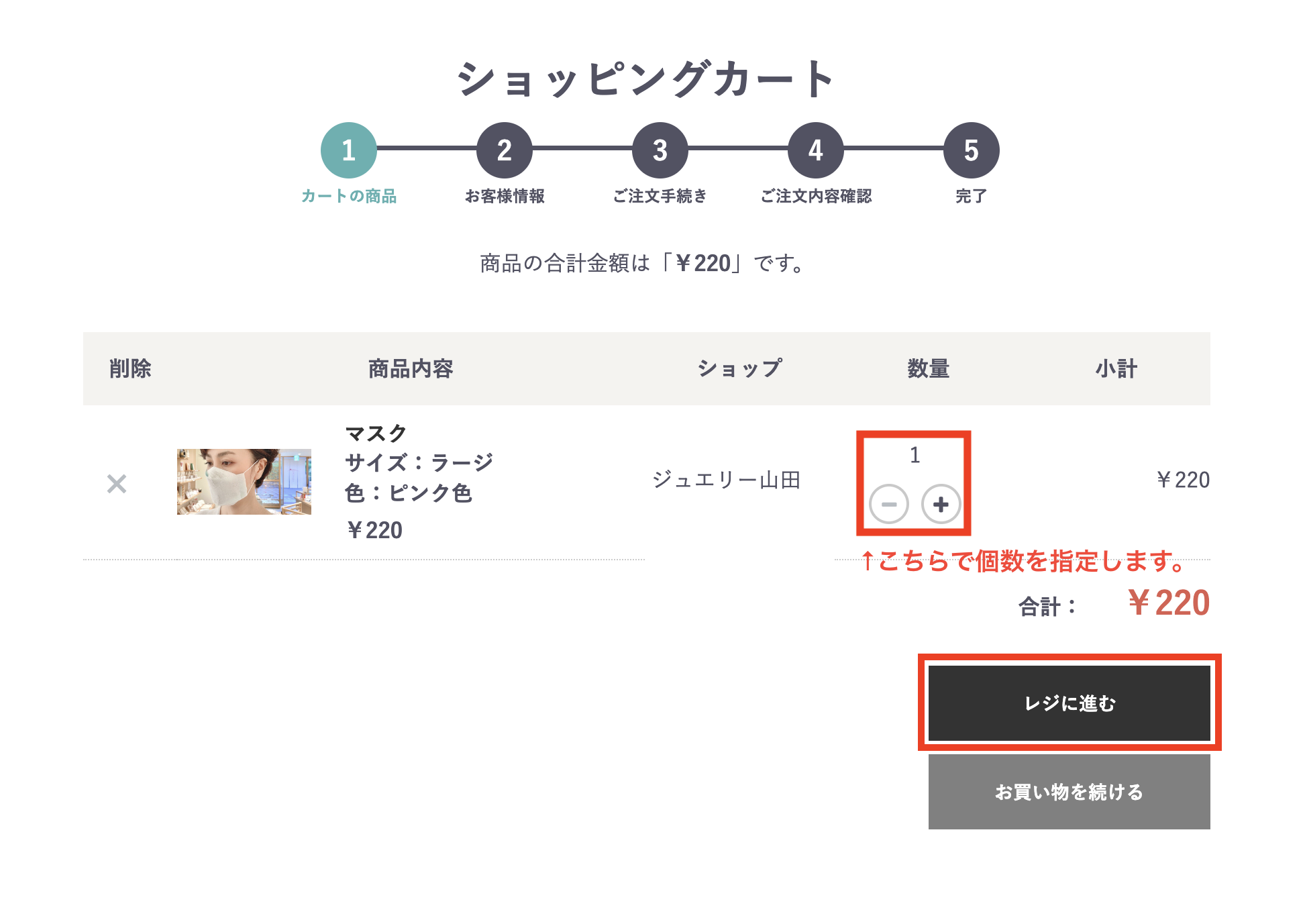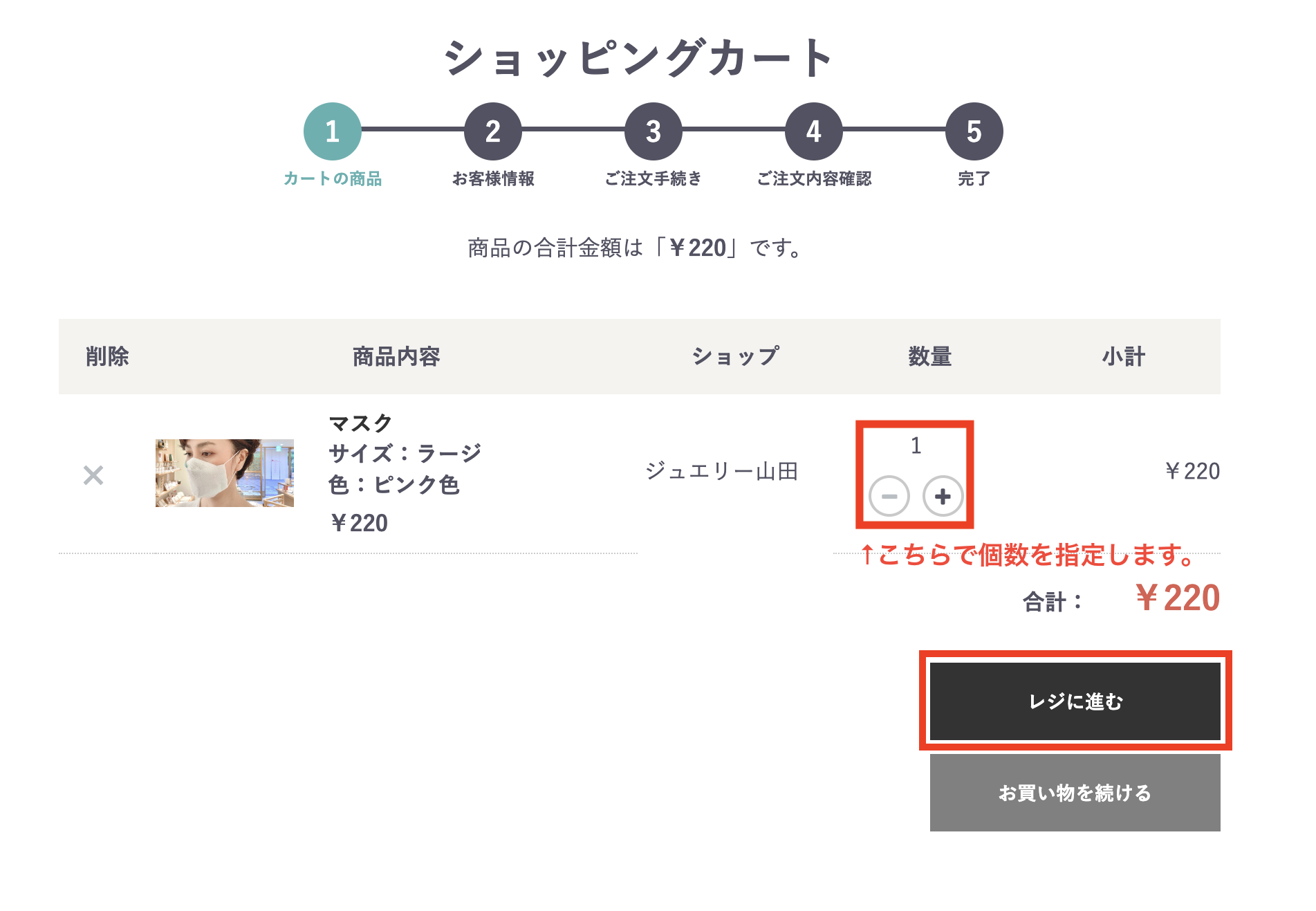 - 商品の数量と金額を確認して、「レジに進む」ボタンをクリックします。