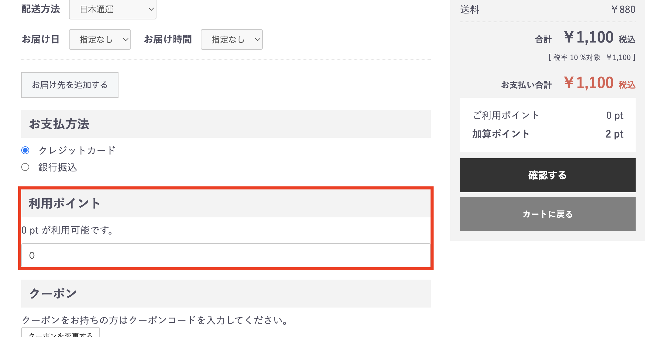 - ご注文の際、カートの「ご注文内容と代金のご確認」で、ポイントの利用を指定してください。 ポイントは1ポイントから無制限にご利用になれますが、ご注文代金(送料・消費税を含む)を限度とします。