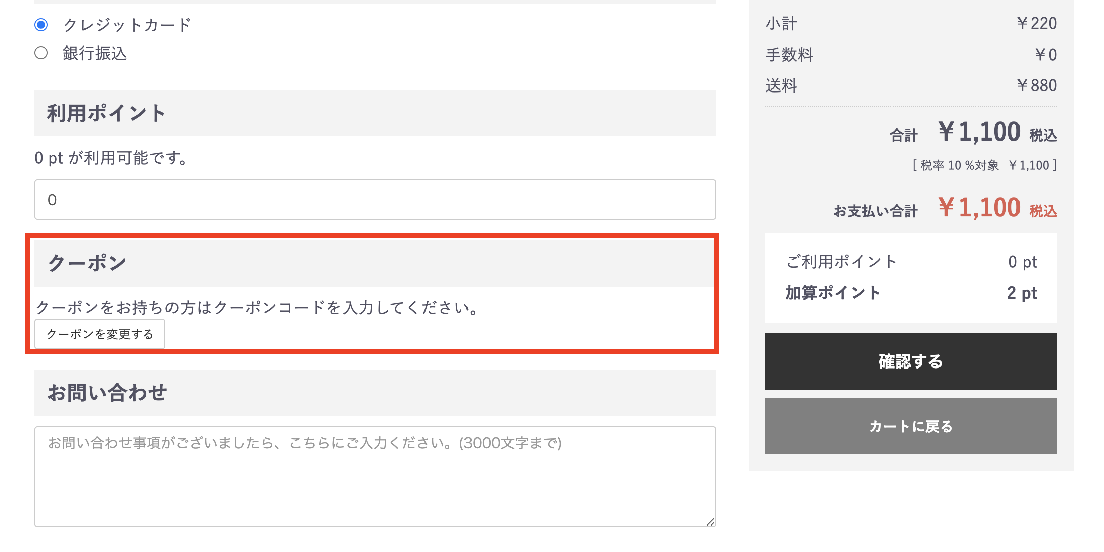 - ご注文の際、カートの「ご注文内容と代金のご確認」で、クーポンコードを指定してください。 ※クーポンを指定せずにご注文をした場合、お手続きが完了後にクーポンの特典を適用することはできません。